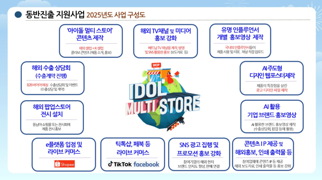 | 첨부파일 | SBS미디어넷 [아이돌스토어 프로젝트] 참여기업 모집 공고 (~5월20일까지)_수정.hwp SBS미디어넷 [아이돌스토어 프로젝트] 참여기업 모집 공고 (~5월20일까지)_수정.pdf (★수출상담회 제출자료, email로 보내주세요★) 수출상담회 신청기업_신청추가정보.xlsx(소개영상) 2025 아이돌멀티스토어 소개 영상_(저용량).mp4 | ||